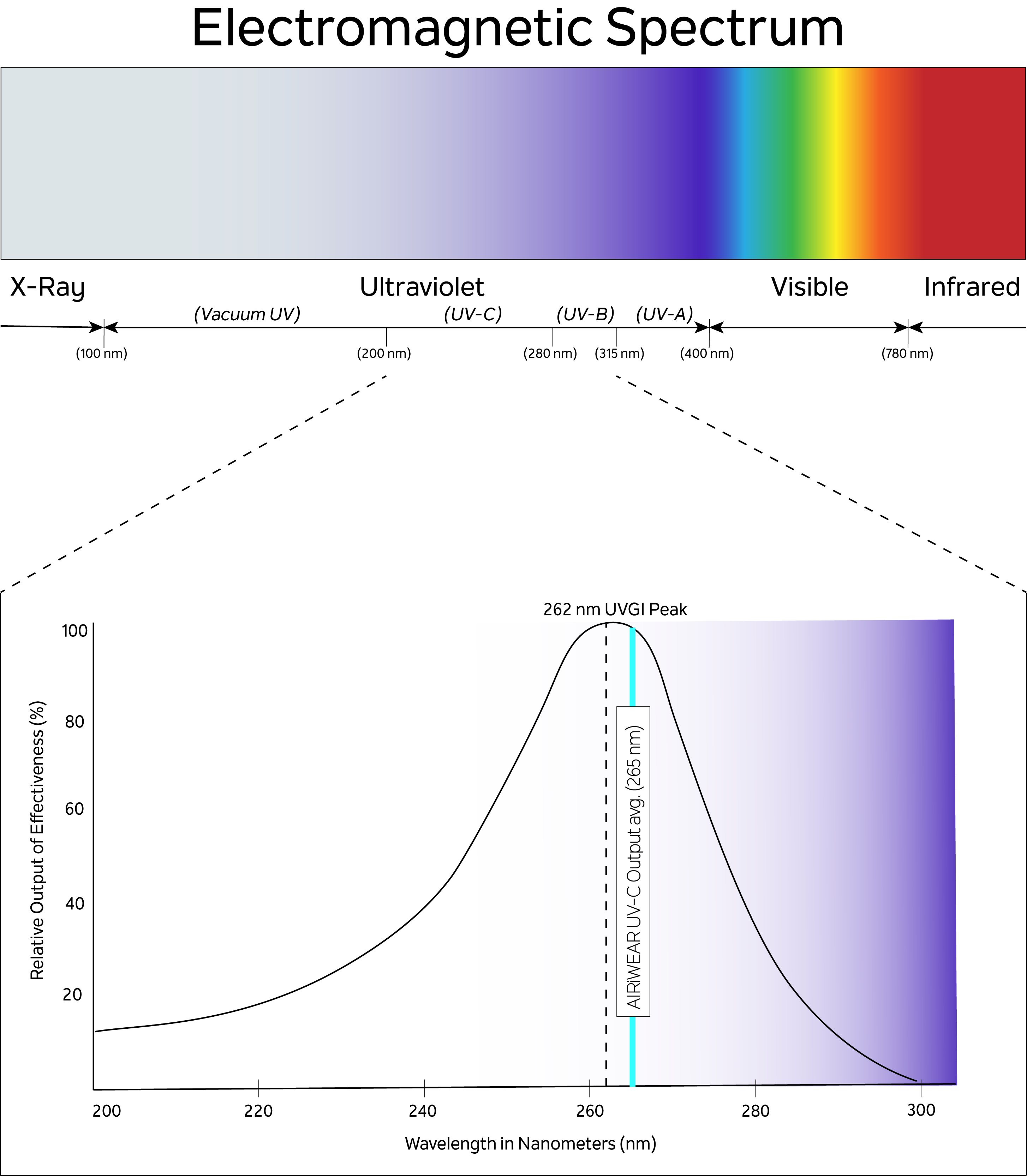 AIRIWEAR uses a specialized UVC light, which produces the optimum wavelength for maximum disinfection.
